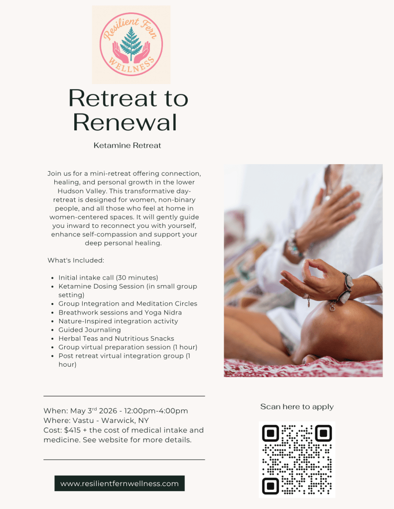 We are excited to announce a new collaboration with Resilient Fern Wellness to offer small-group Ketamine-Assisted Psychotherapy (KAP) retreats beginning in 2026. Together, we’re creating supportive, trauma-informed spaces designed to help you deepen your healing journey with care, connection, and skilled guidance.